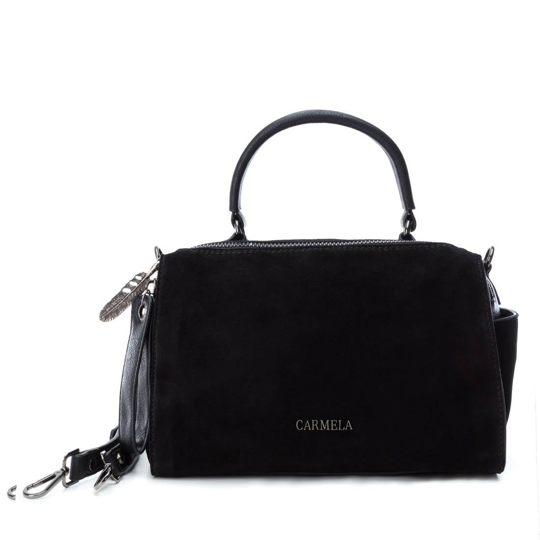 Carmela brand leather bag with central zipper and interior pockets. Double handle, one of them adjustable. Carmela logo on the front.