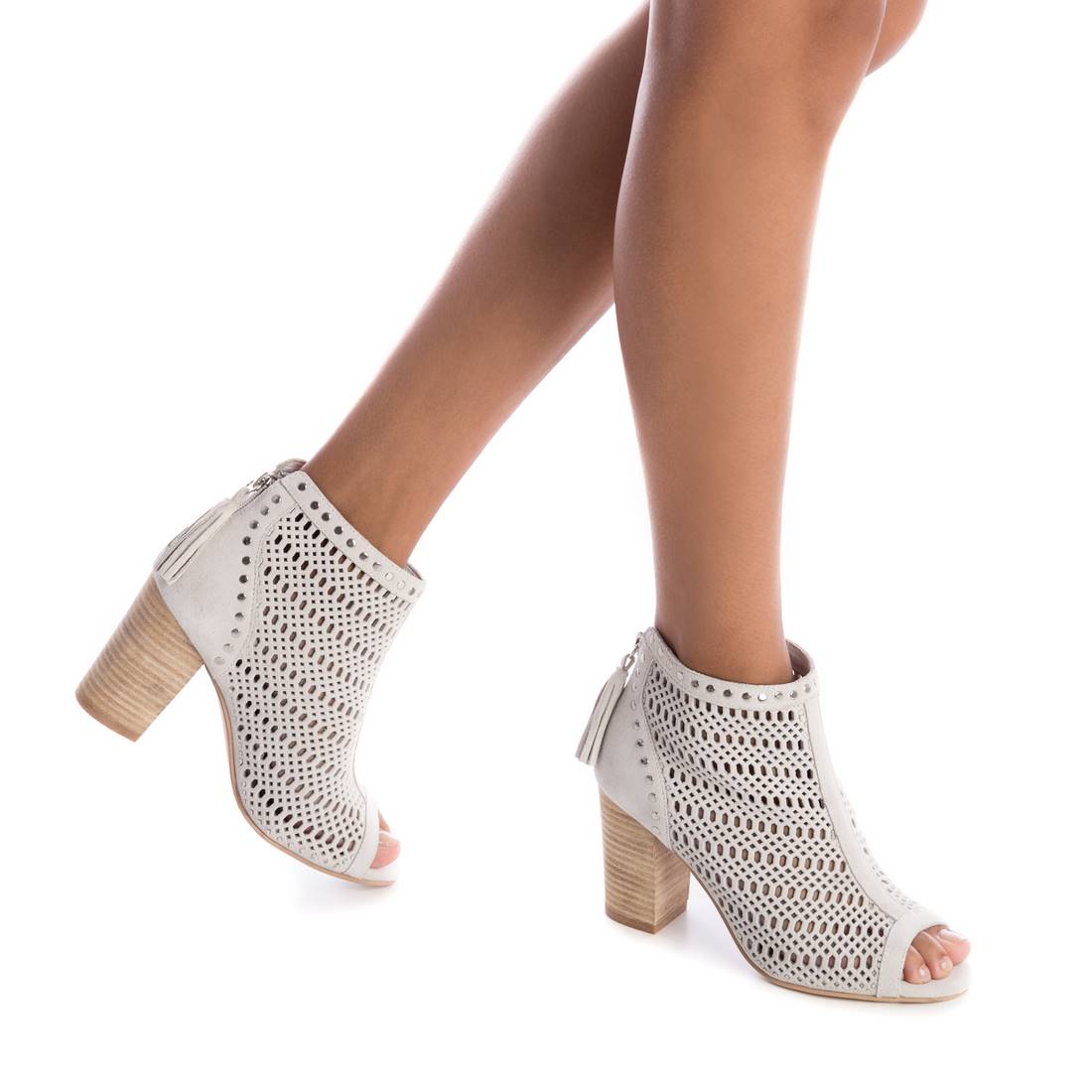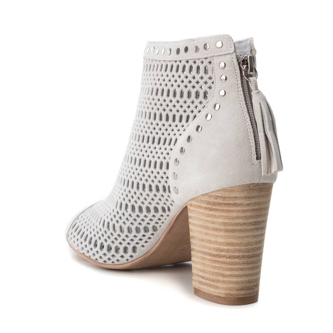 Women's leather ankle boot with a wide 9 cm heel. Open toe and cutouts with studs on the sides. Ideal for wearing with jeans. High-quality leather sole and upper.