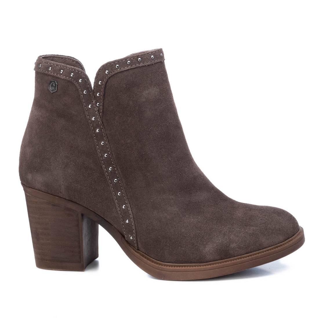 Women's ankle boot with a wide 8 cm heel. Carmela brand ankle boot made of suede leather. Decorative metal studs on the sides. Rubber sole and side zipper closure.