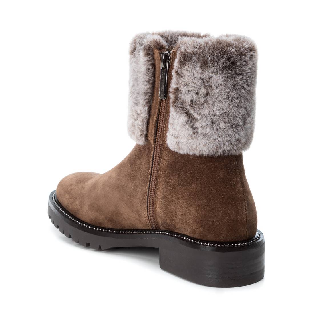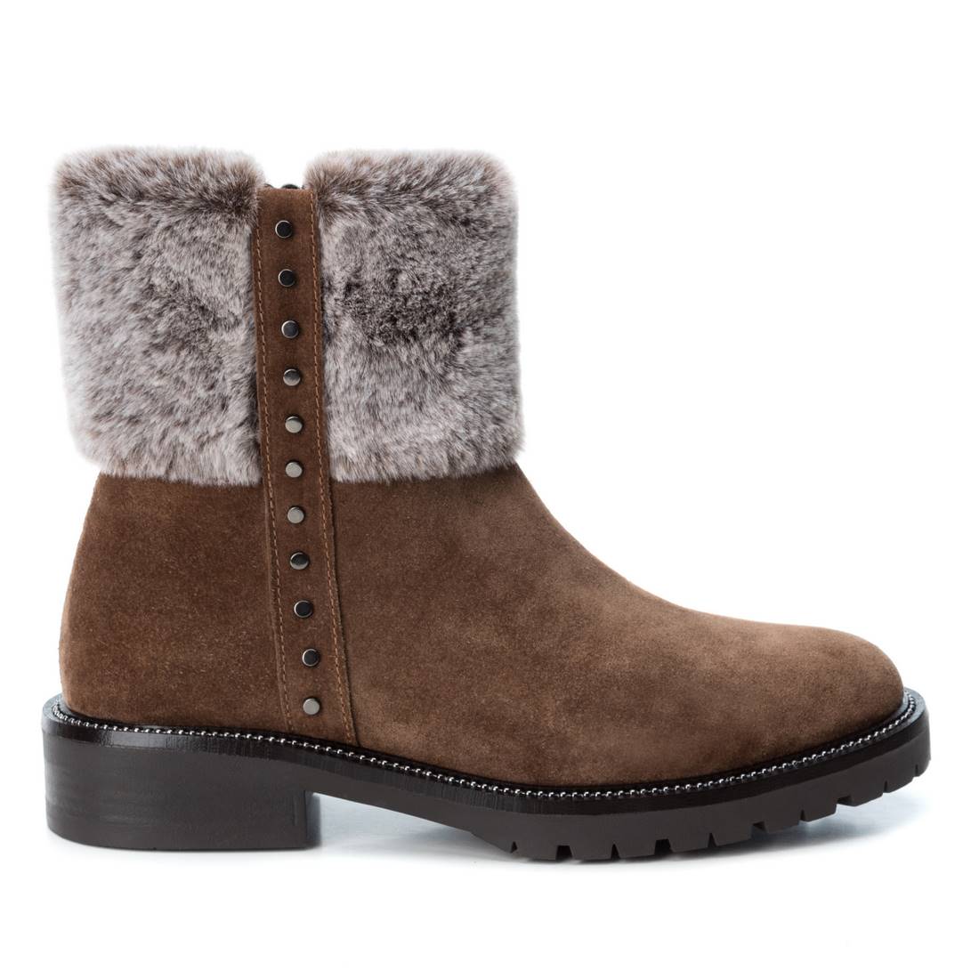 Women's leather ankle boots from the Carmela brand. Ankle boots with a side zipper and decorative studs on the sides. Fur on the outside and inside. Ideal for winter days. Rubber sole.