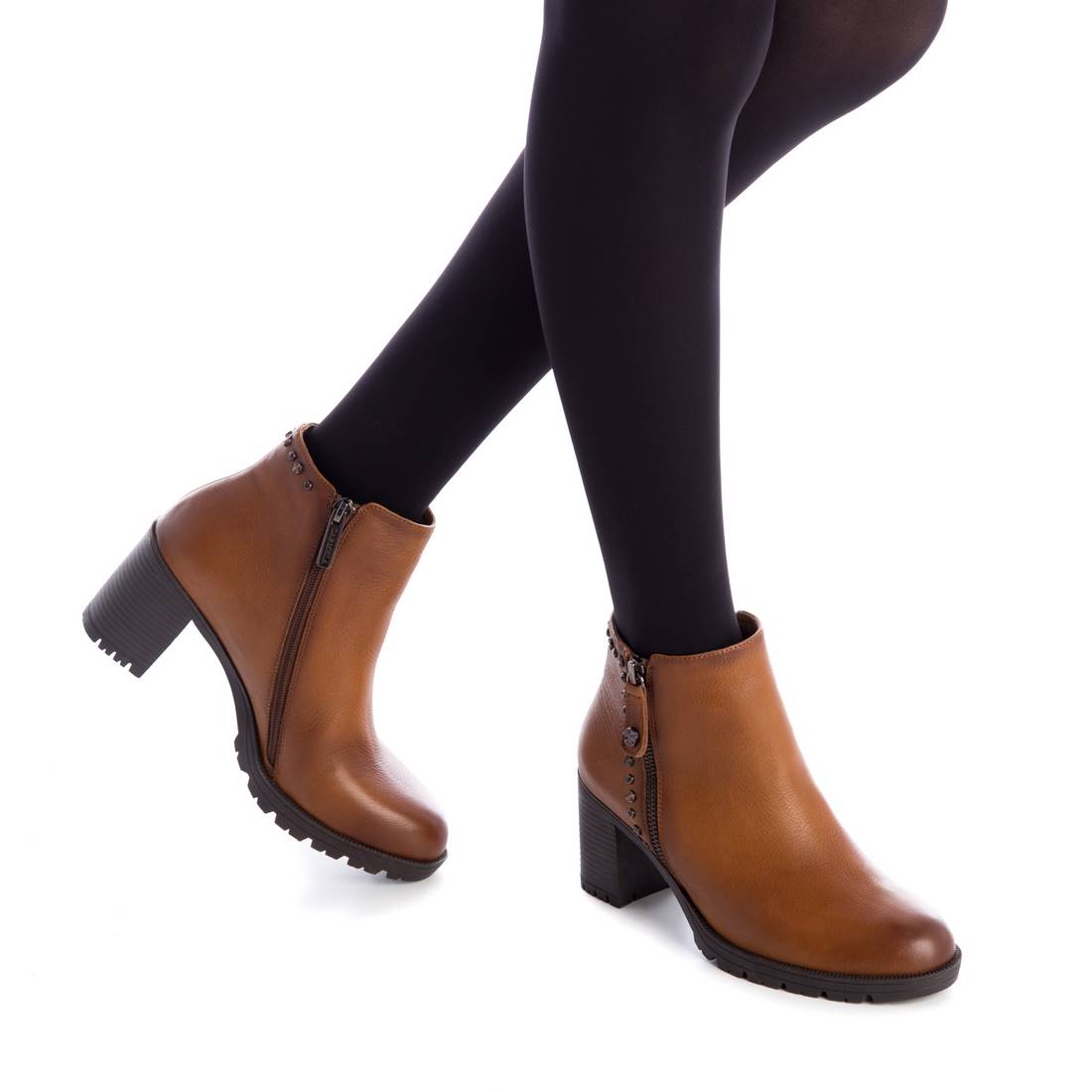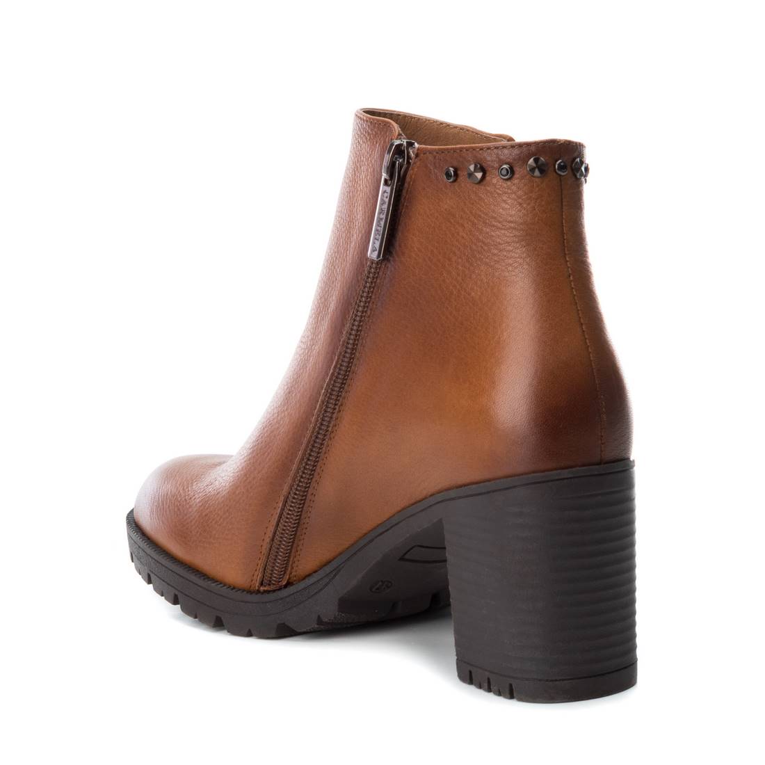 Women's ankle boot with a 7 cm heel from the Carmela brand. Made of high-quality leather with decorative studs on the back. Zip closure. Rubber sole.
