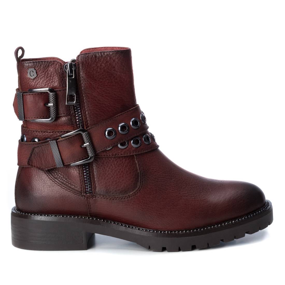Women's flat ankle boot from the Carmela brand. Made of leather. Decorative buckles on the upper instep, side zipper closure. Rubber sole and leather insole.