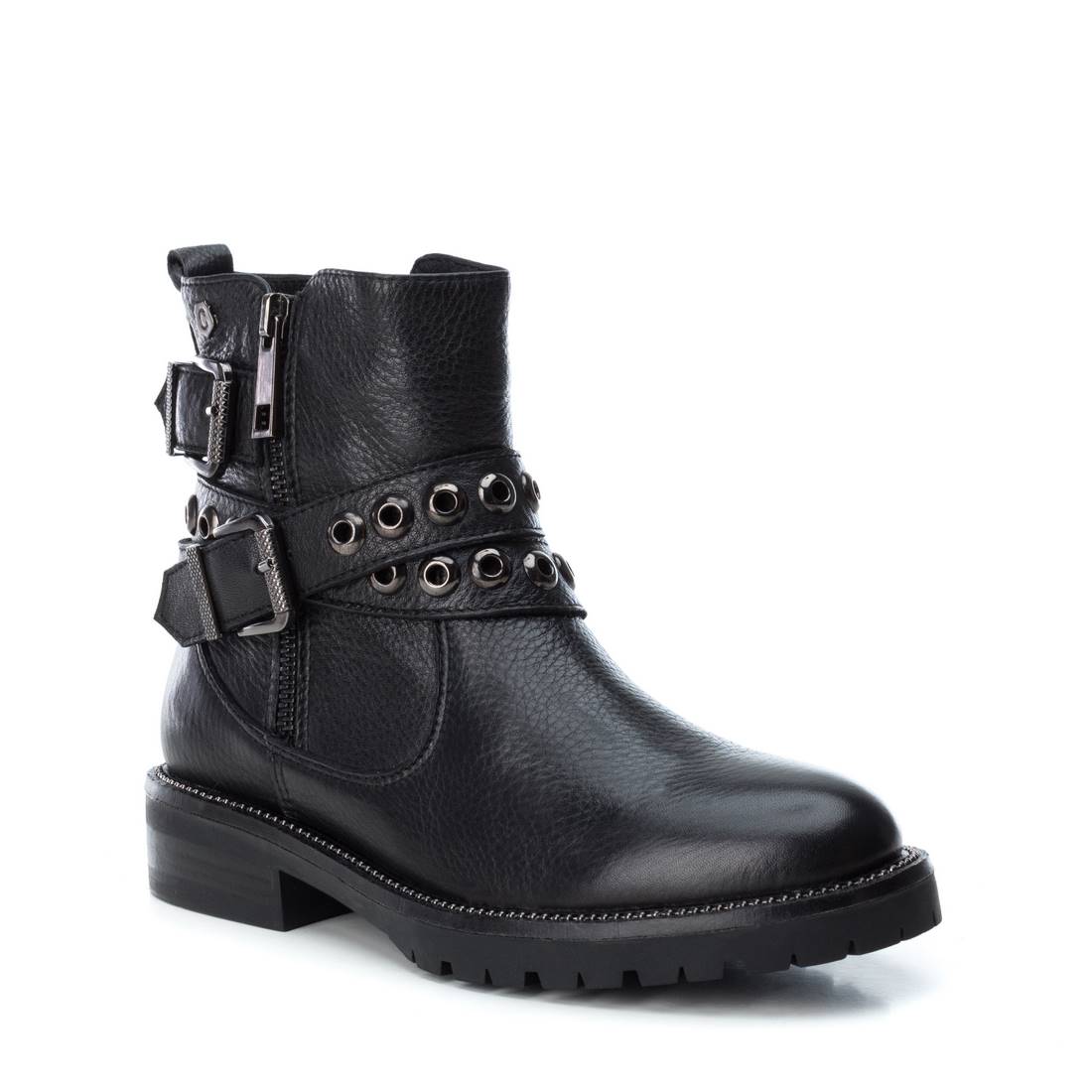 Women's flat ankle boot from the Carmela brand. Made of leather. Decorative buckles on the upper instep, side zipper closure. Rubber sole and leather insole.