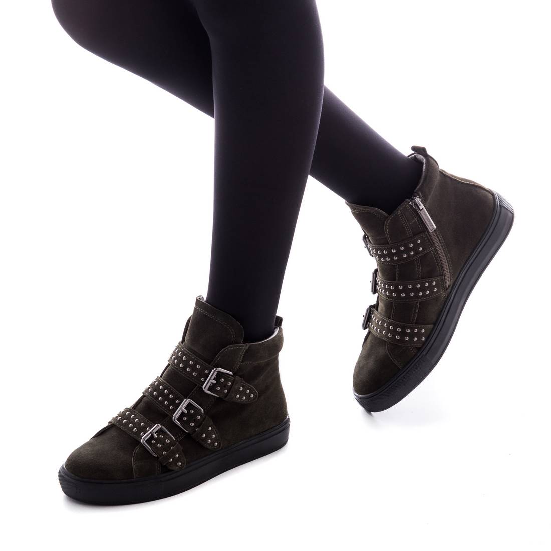 Women's flat ankle boot from the Carmela brand. Made of suede leather with a side zipper. Straps with metal studs and decorative buckles on the upper instep. 3 cm black rubber sole.