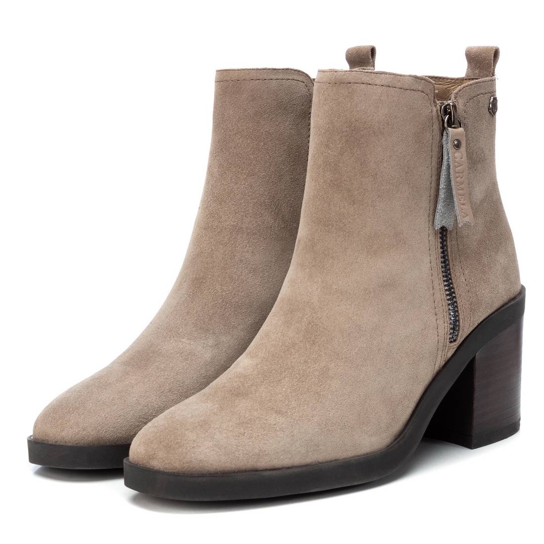 Women's country-style ankle boot with a 7 cm heel from the Carmela brand. Shaft height is 12 cm. Made of suede and with a non-slip rubber sole for greater comfort. Zip closure. A go-with-everything ankle boot that's a must-have in your wardrobe.