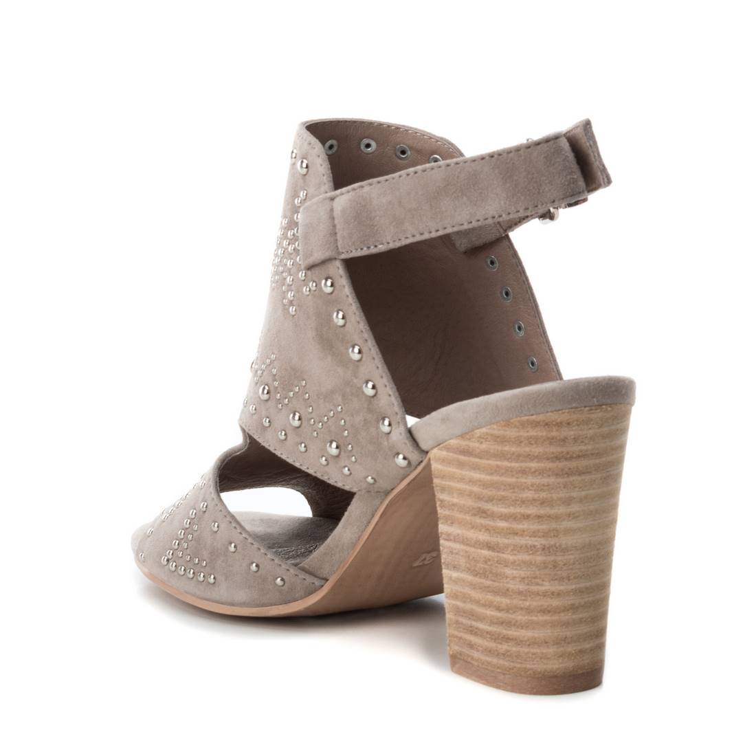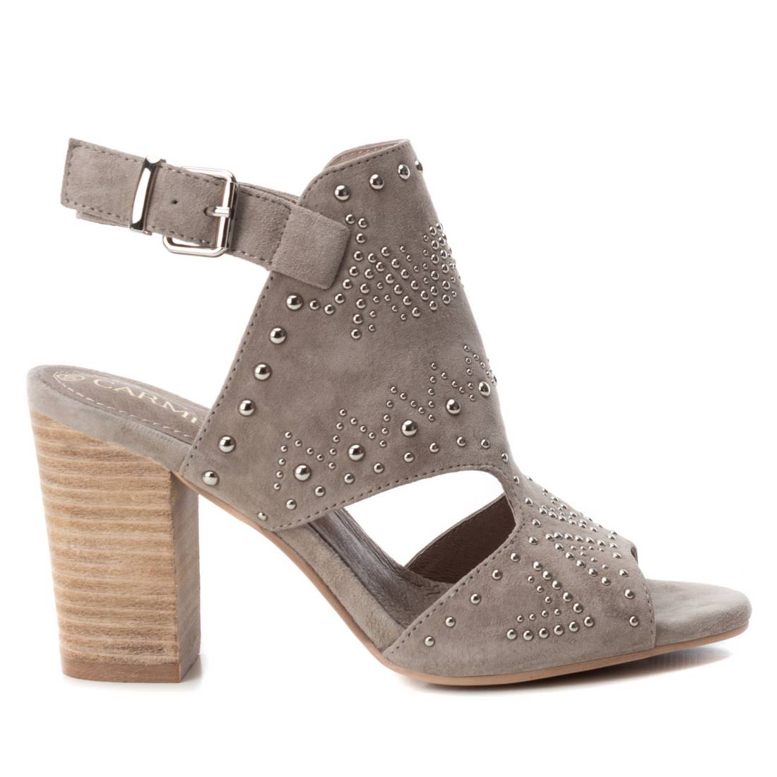 Women's sandal with a 9 cm wide heel made of leather. Very original sandal with studs on the cut and side buckle to facilitate adjustment. Both the cut and the insole are made of high quality leather.