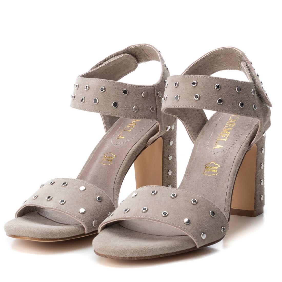 Women's sandal with 10 cm wide leather heel. Very original sandal with decorative studs. Velcro on the back for easy putting on. Leather cut and insole. Very light.