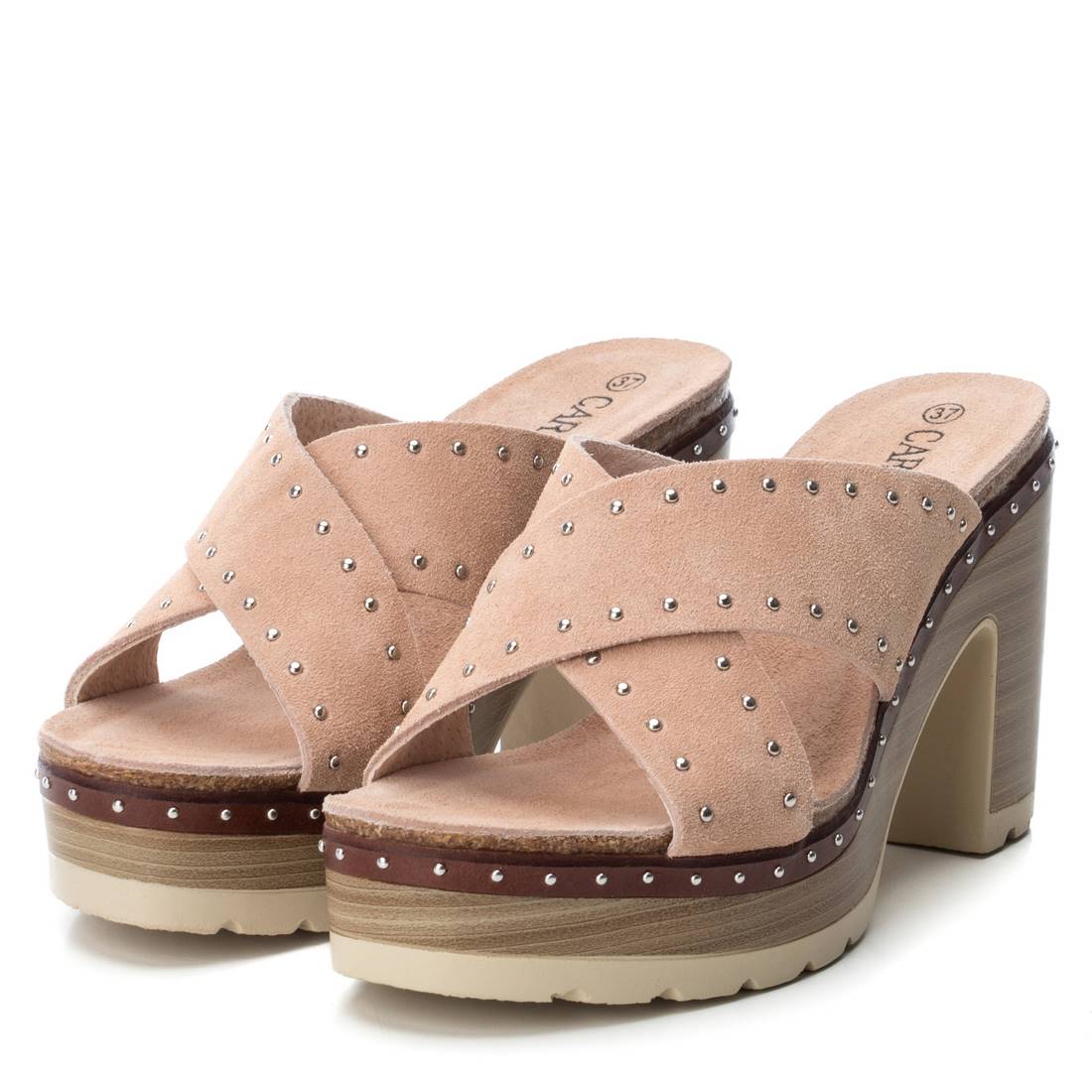 Women's sandal with 10 cm heel and 3 cm platform. Made of leather, both the cut and the insole. Decorative studs on the crossed straps of the instep and on the top of the sole. An ideal sandal for this spring.