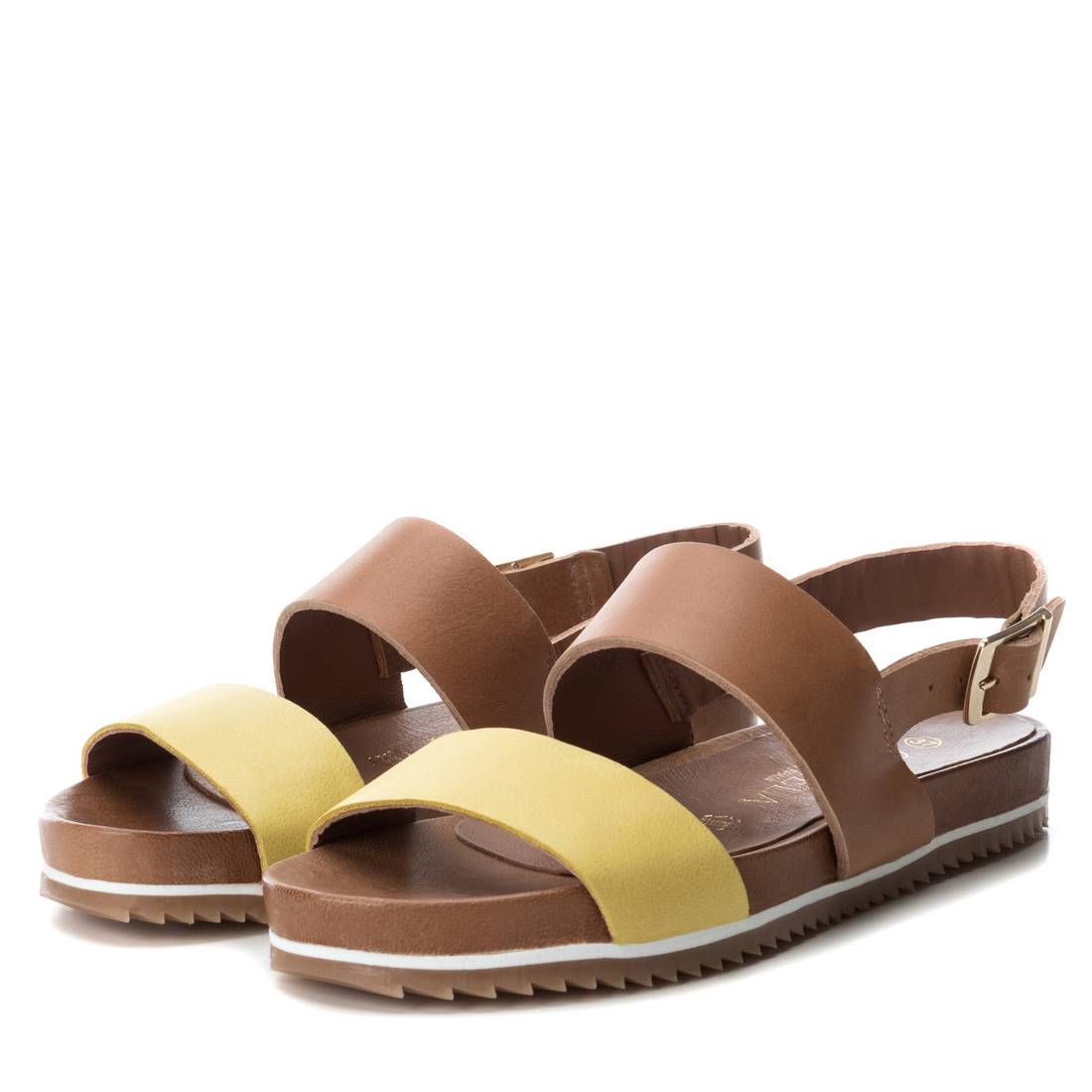 Flat women's sandal made of leather. Leather insole with printed Carmela logo. Wide combined straps on the instep. Rubber sole.