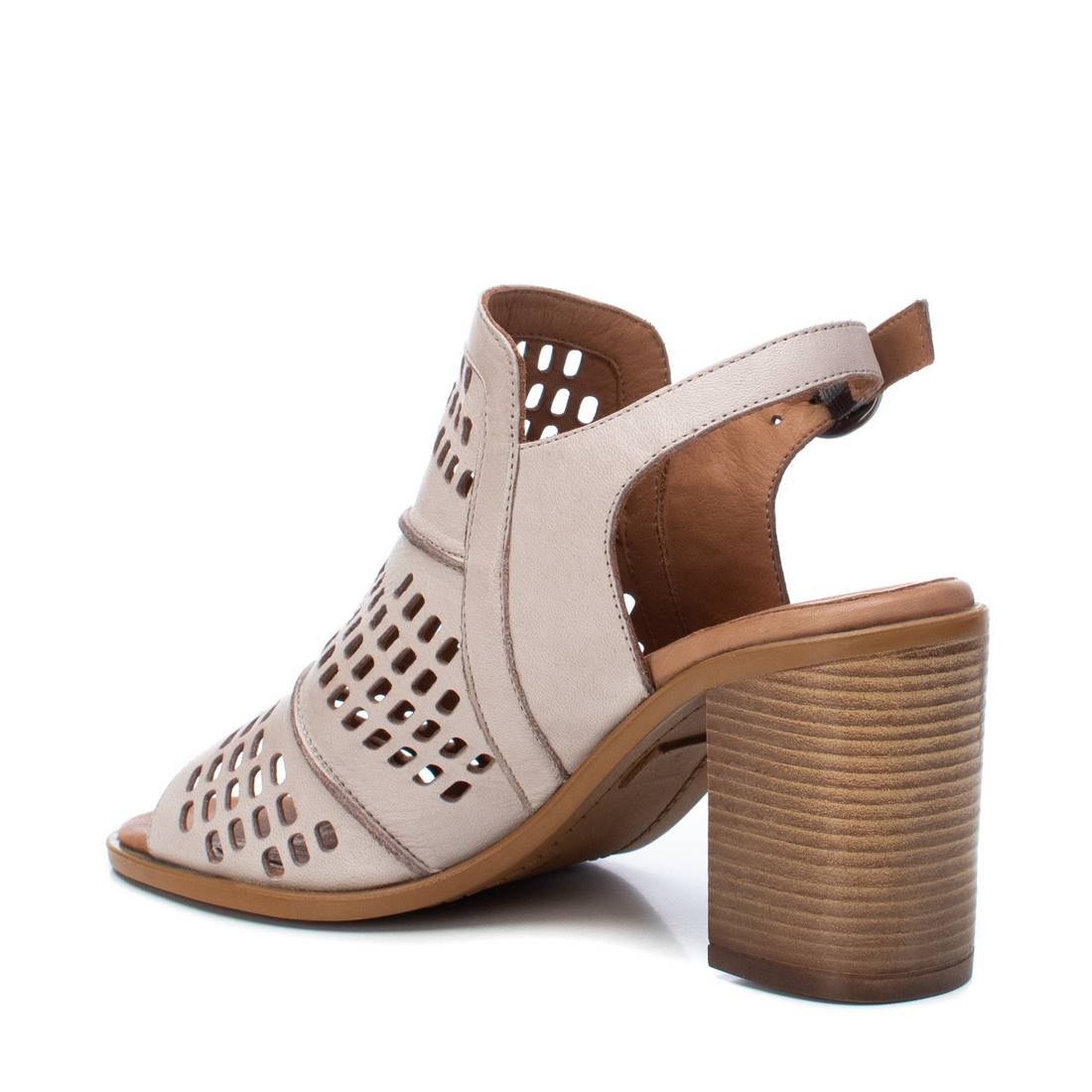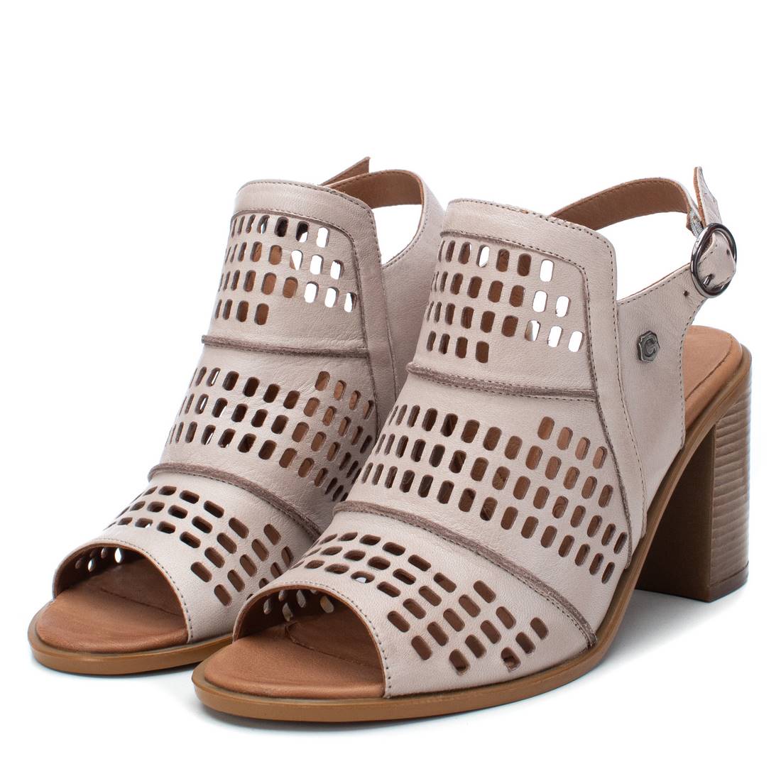 Women's sandal with 8 cm heel from the Carmela brand. Sandal made of leather with die-cuts and side buckle closure. Ideal sandal for this season due to its design and quality. Flexible rubber sole.