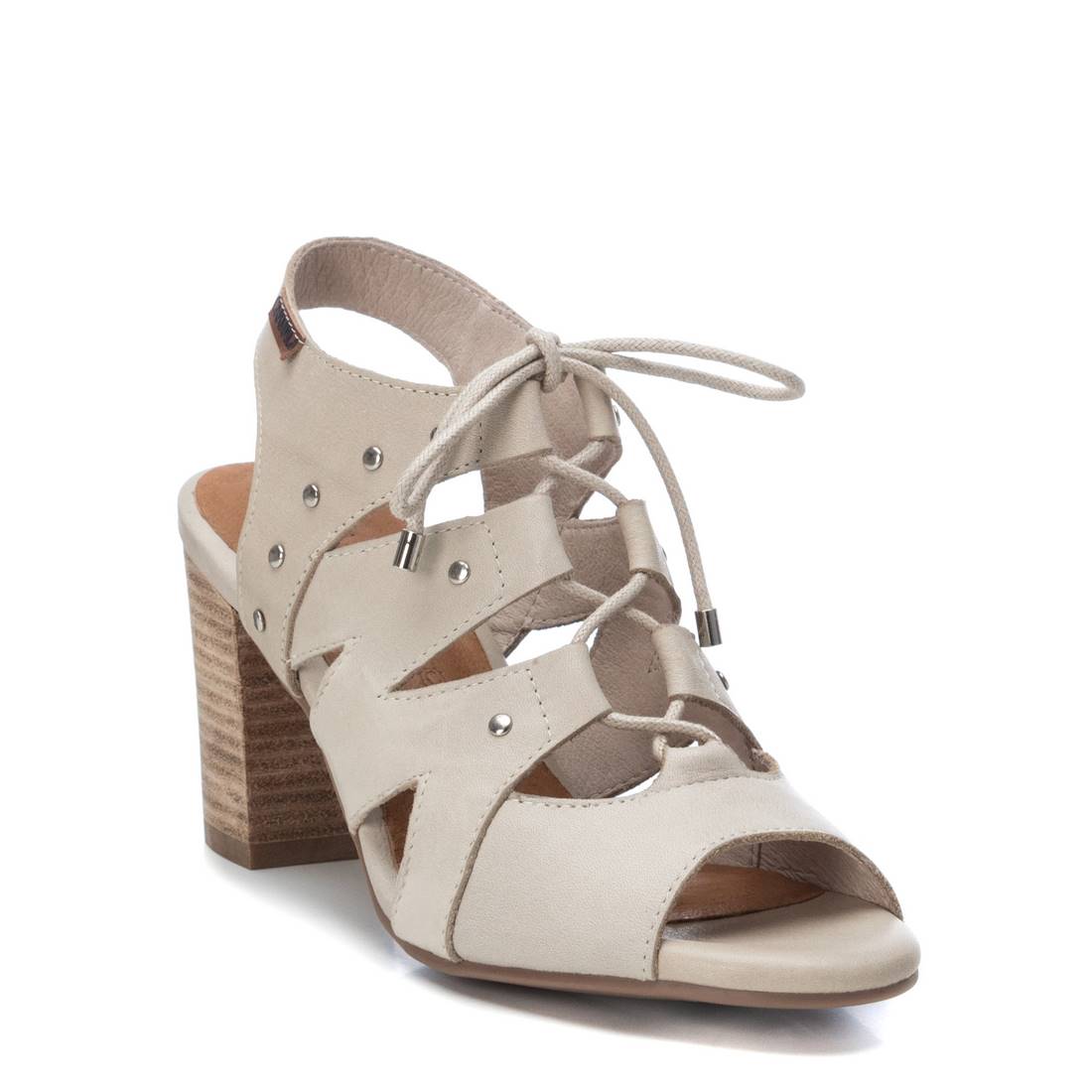 Women's sandal with 8 cm heel made of leather from the Carmela brand. Criss-cross straps on the instep and drawstring closure at the top. A sandal with a lot of style and quality. Rubber sole.