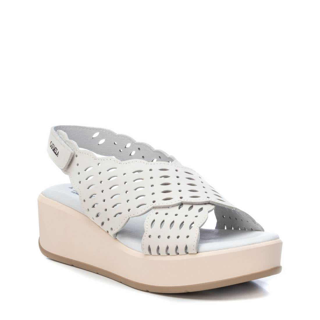Carmela brand women's sandal. Sandal made of very soft leather with die-cuts. Adjustable velcro closure. 4 cm wedge and 2 cm platform made of leather. Rubber sole and leather insole.