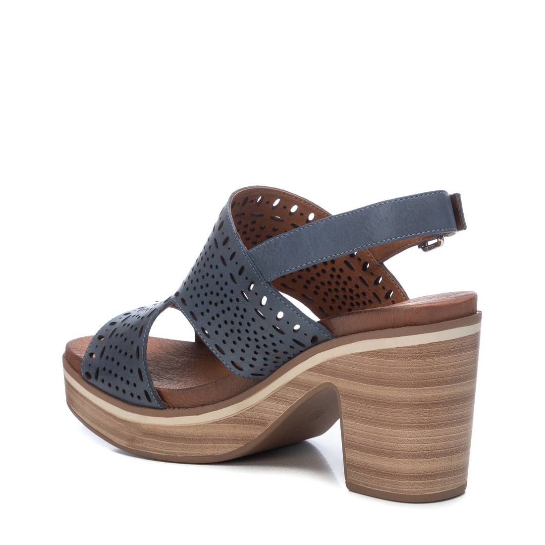 Carmela brand women's sandal. 8 cm high heel. Central tape with die-cutting made of high quality leather with side openings. Side buckle closure. Ideal to combine with jeans.