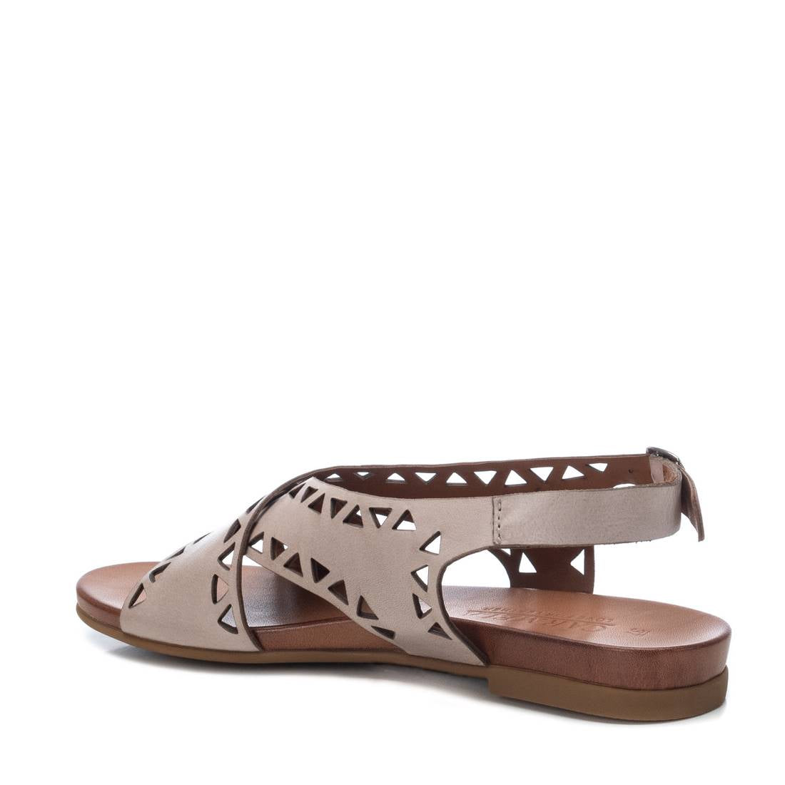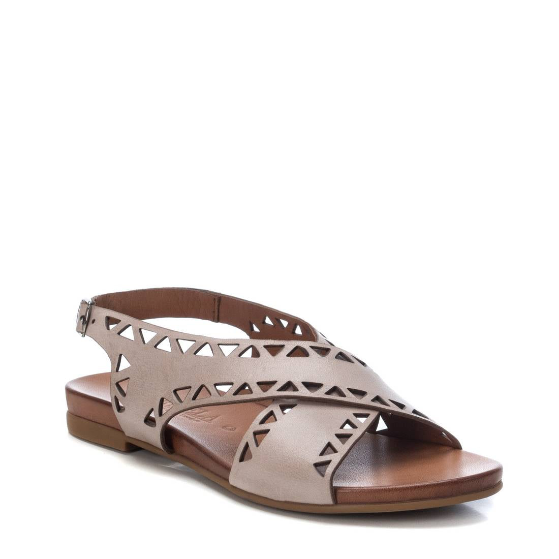 Women's flat sandal from the Carmela brand. Rubber and non-slip sole and leather insole. Two high-quality leather straps crossed with die-cutting and with ankle grip via side buckle. Comfortable sandal, perfect to wear every day.