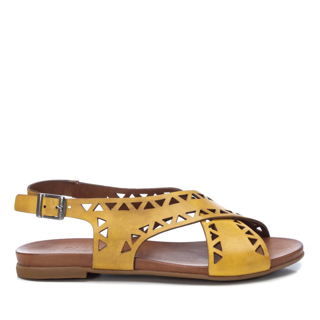 Women's flat sandal from the Carmela brand. Rubber and non-slip sole and leather insole. Two high-quality leather straps crossed with die-cutting and with ankle grip via side buckle. Comfortable sandal, perfect to wear every day.
