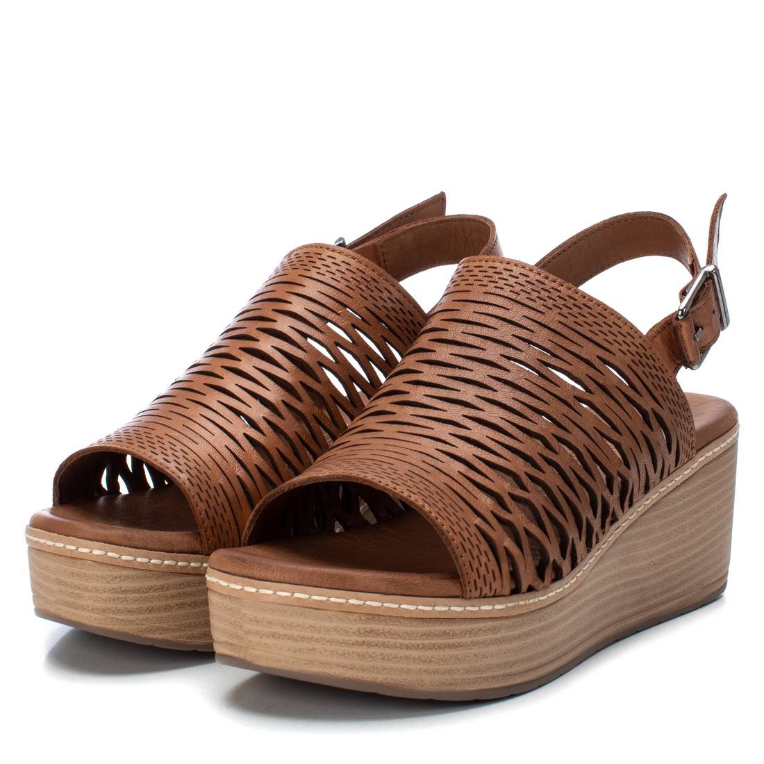 Carmela brand women's sandal with 7 cm wedge. Leather insole and non-slip sole. Thick, high-quality leather strap with die-cutting, exposing the heel and toe. Side buckle closure. Perfect sandal to combine with jeans.