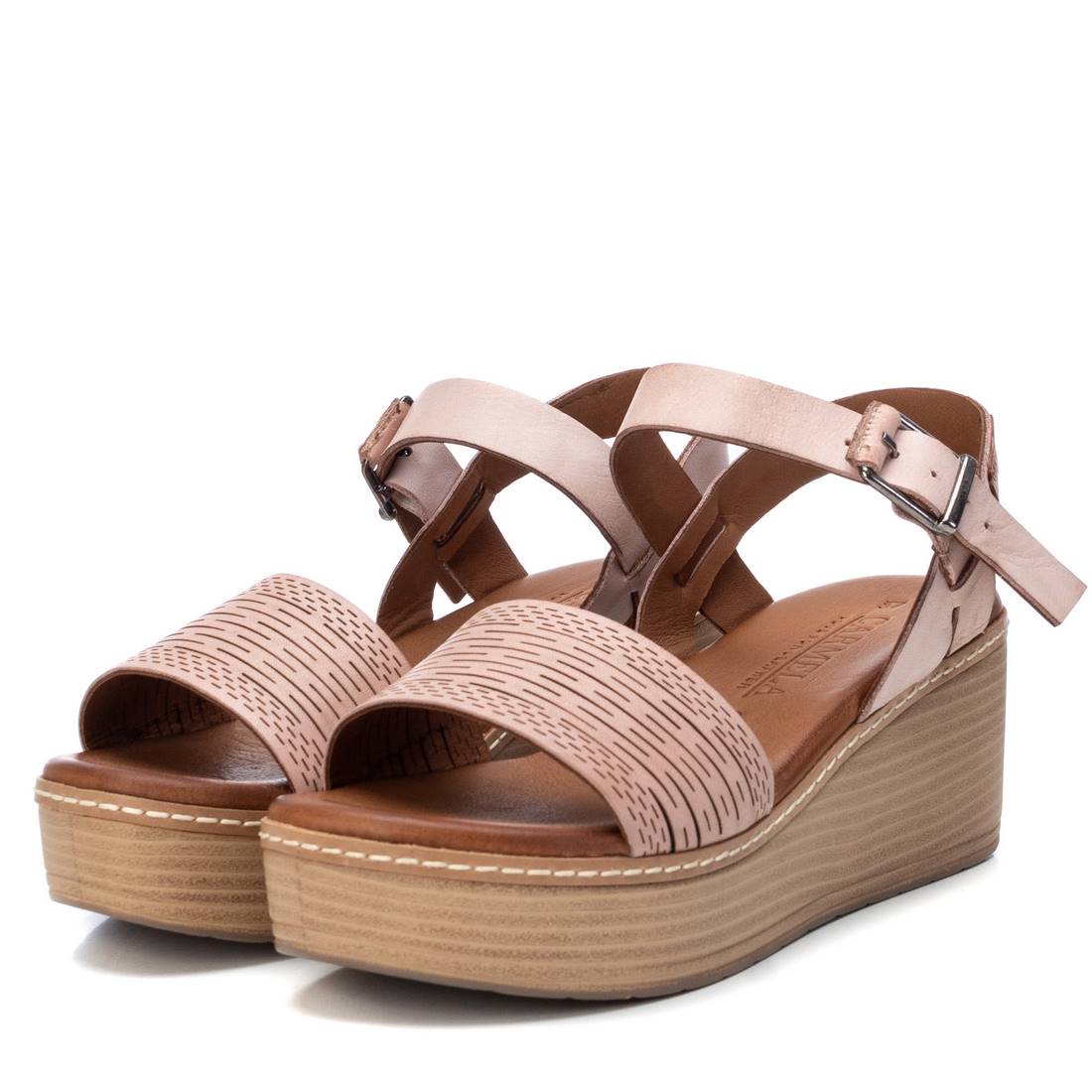 Women's sandal with 7 cm high wedge. Carmela brand sandal with non-slip sole. Thick ribbon on the front with die-cutting. Side buckle closure and ankle grip. Ideal and comfortable sandal to wear every day.