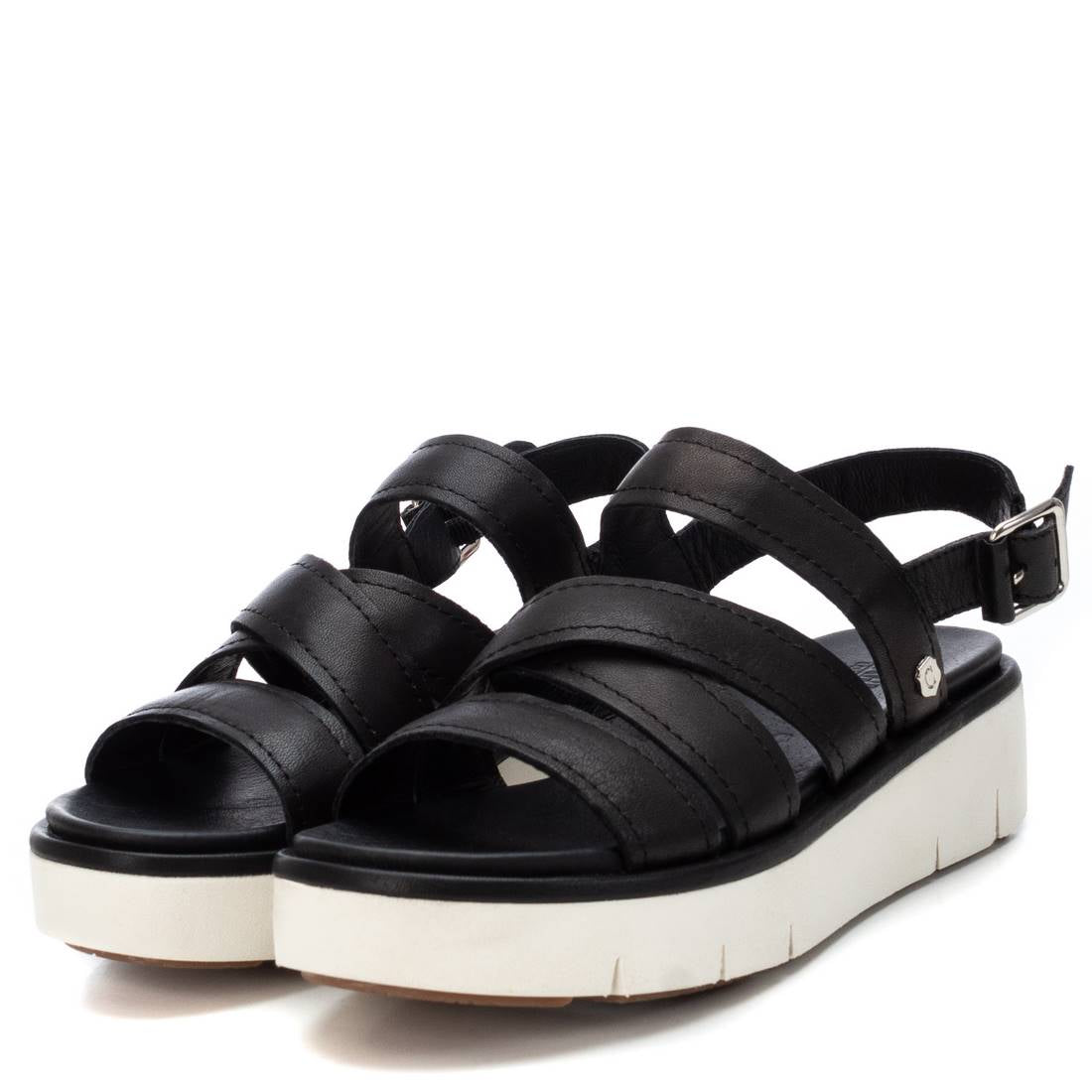 Women's sandal, Carmela brand. Made of high quality leather strips. Back bracelet with metal buckle on the side to adjust to the ankle. Comfortable padded sole with thick 4 cm high non-slip rubber sole. This season you won't have to reject comfort to be fashionable.