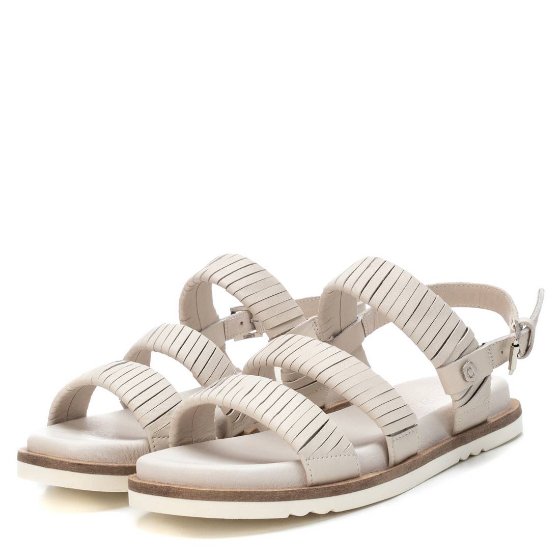 Women's flat sandal, Carmela brand. Three strips of padded leather with artisanal effect cuts. Buckle closure. Plant lined to match. Non-slip rubber sole. A very innovative current model that cannot be missing from your wardrobe this season.