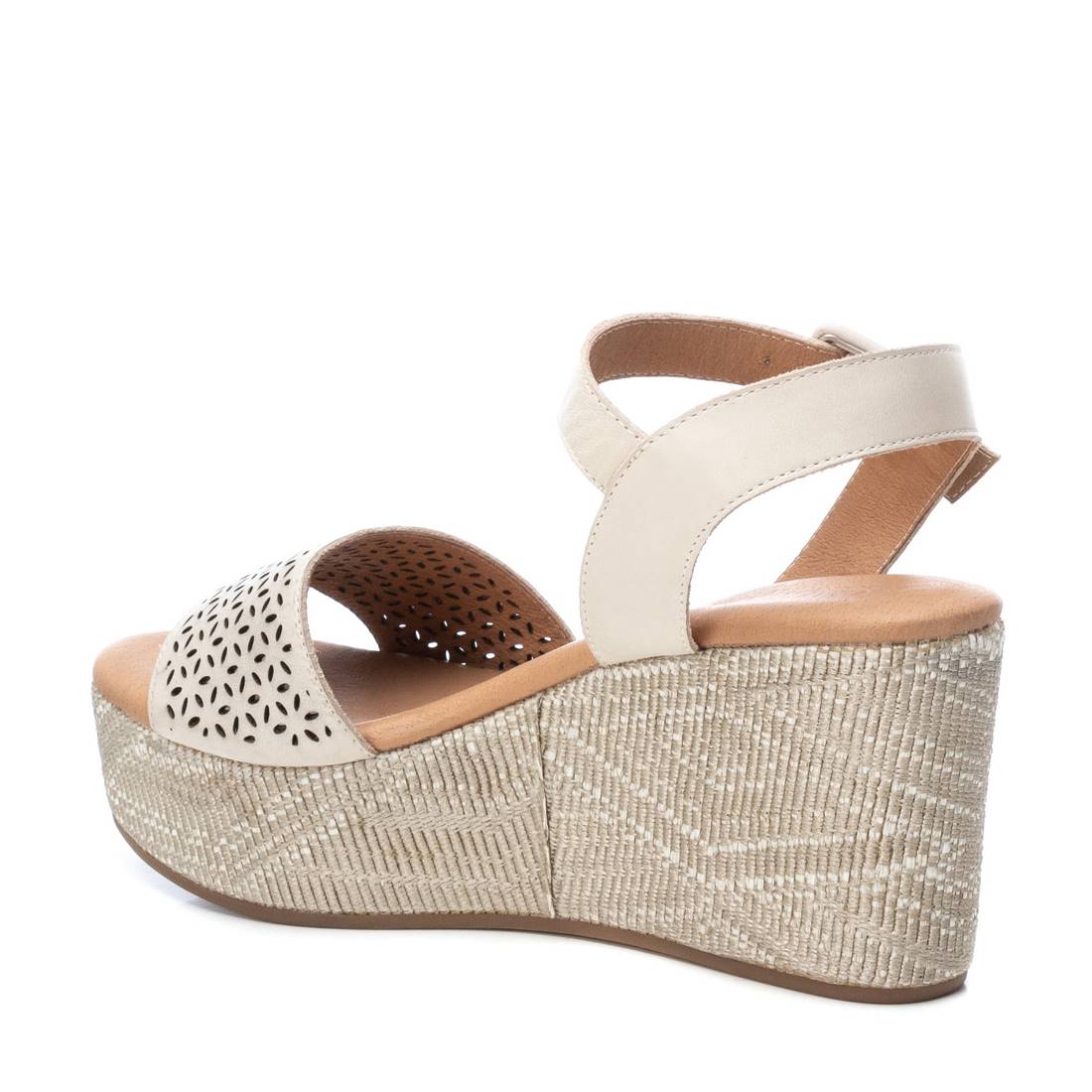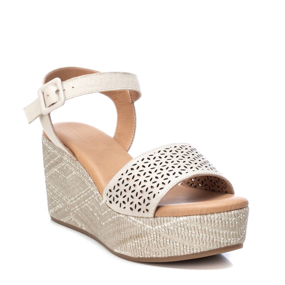 Women's sandal with 8 cm wedge from the Carmela brand. Made of high quality leather. Original die-cut shovel. Bracelet with matching buckle to adjust the ankle. Comfortable wedge plant lined with a beautiful geometric design. Non-slip rubber sole.