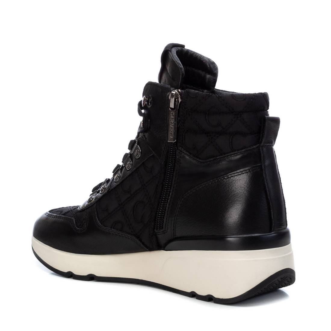 Carmela brand wedge boot. Made of leather, including the insole. It combines textile parts, forming a beautiful quilted pattern. Zipper closure. Laces with metal pins. Padded collar. Non-slip rubber sole.
