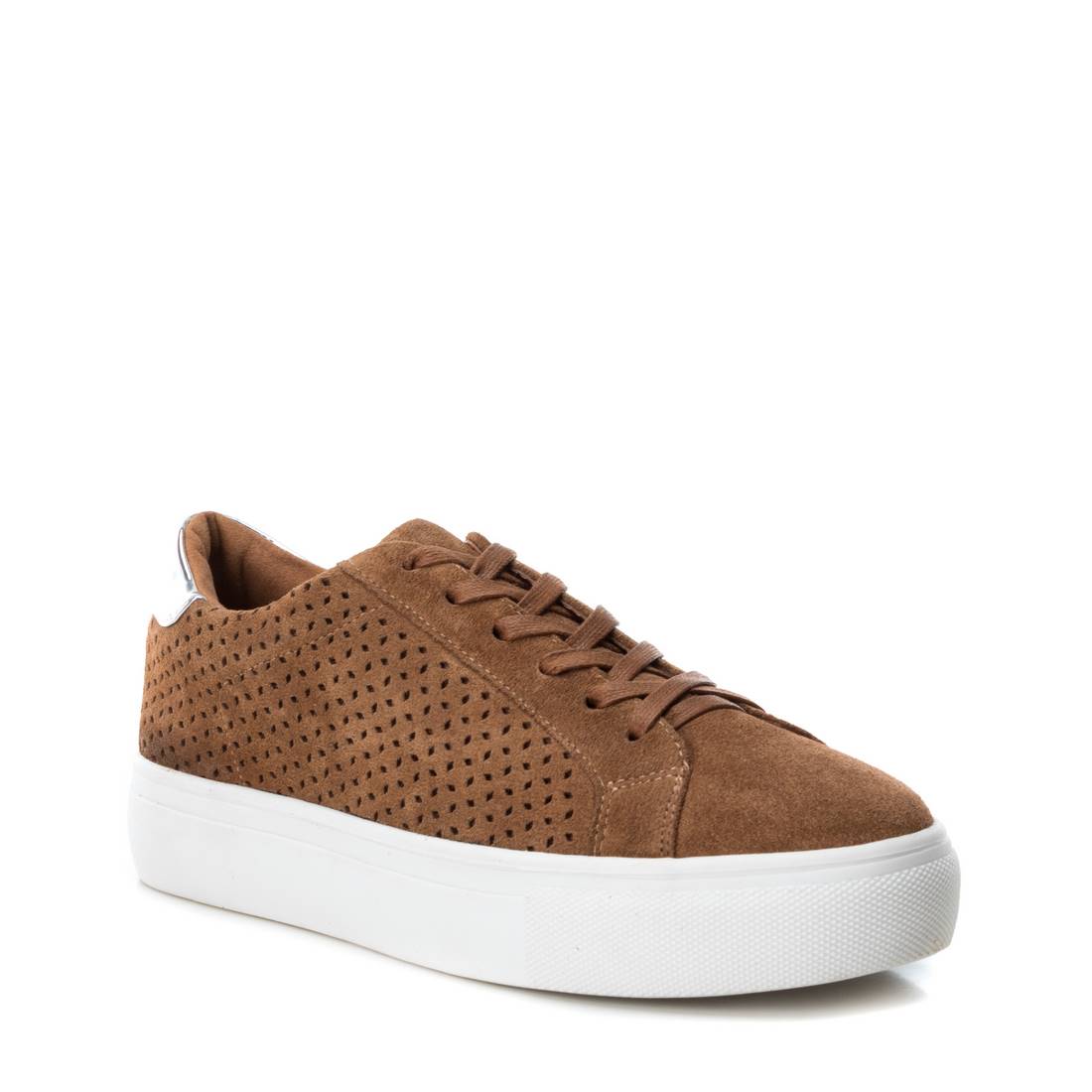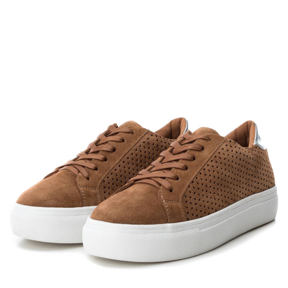 Casual style women's sneaker made of leather and 3 cm white rubber sole. Cut on the sides with a die-cut design. Matching laces.