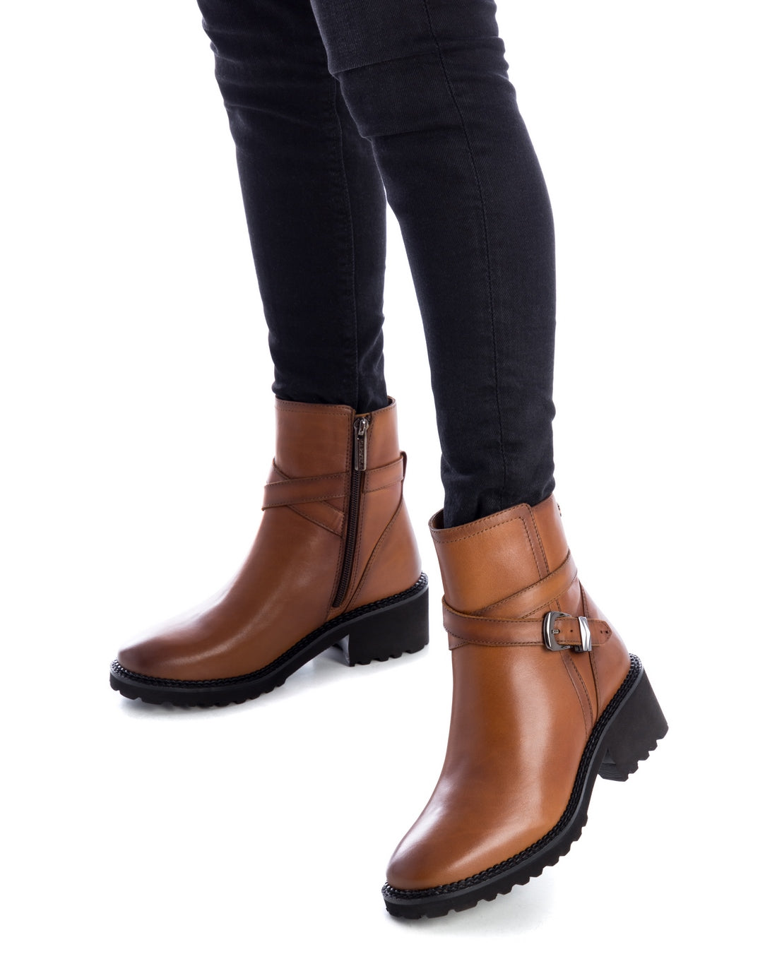 Botín de mujer, de la marca Carmela. Fabricado en piel de alta calidad. Cierre mediante cremallera interna. Tira decorativa en el lateral con hebilla metalizada. Suela de goma antideslizante. Botín sencillo que podrás combinar con todas tus prendas esta temporada.