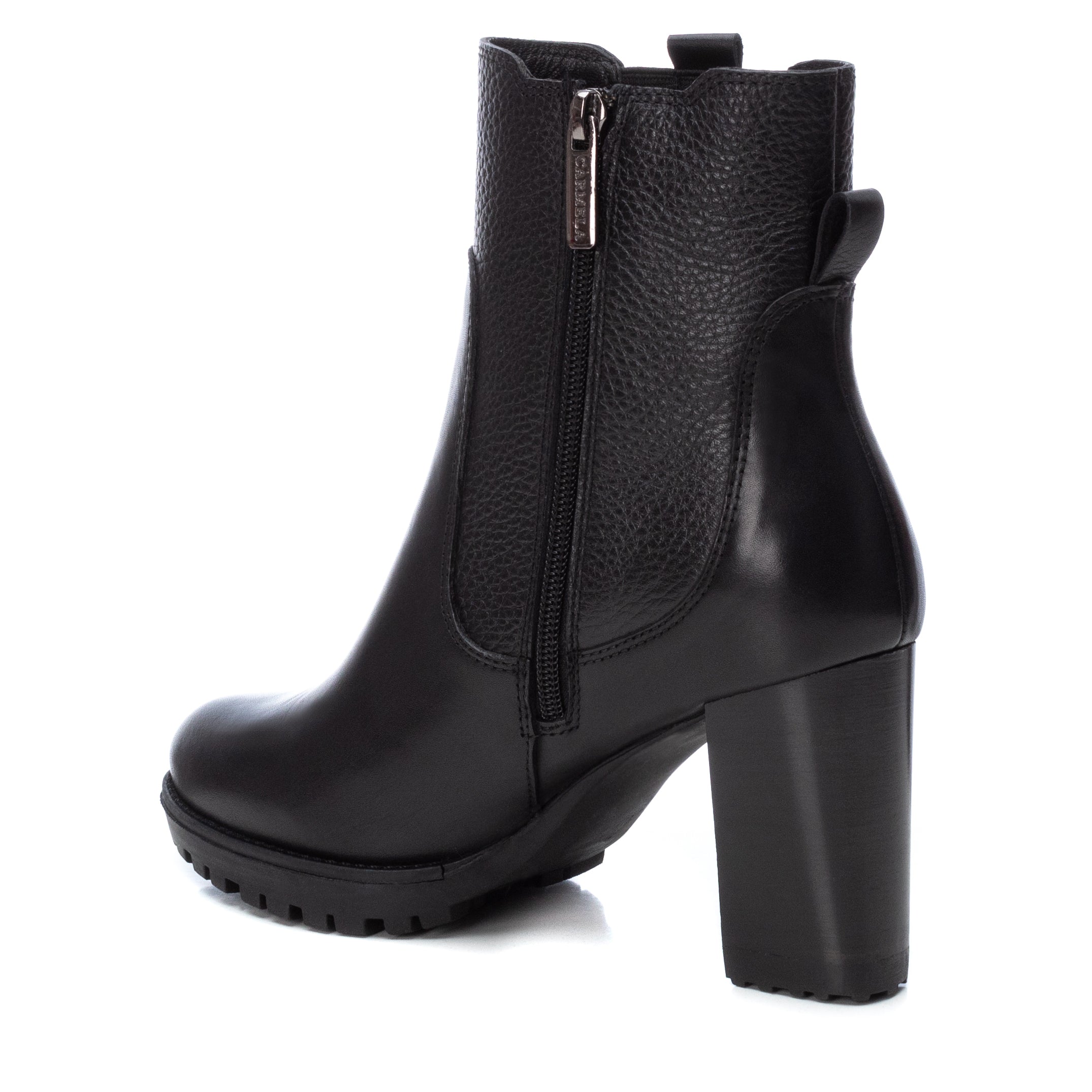 Botín de mujer, de la marca Carmela. Fabricado en piel de alta calidad. Textil elástico en su lateral con tirador decorativo. Cómodo tacón de 9 cm de altura con suela de goma antideslizante.