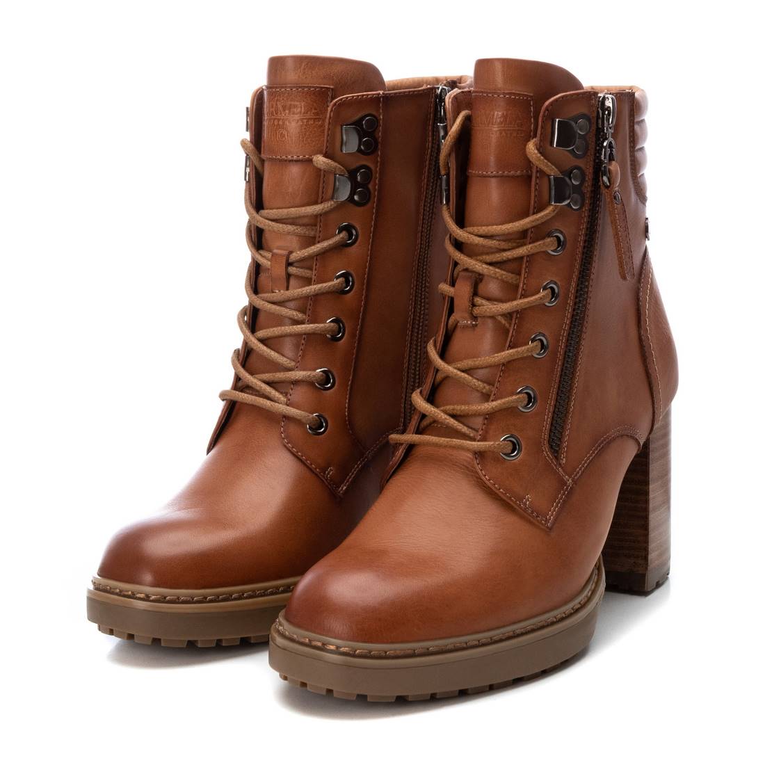 Botín de mujer, de la marca Carmela. Fabricado en piel de alta calidad. Cierre mediante cremallera lateral y cordones para un buen ajuste. Collarín acolchado estilo montañero y cremallera lateral decorativa. Tacón ancho de 8 cm y suela de goma antideslizante.