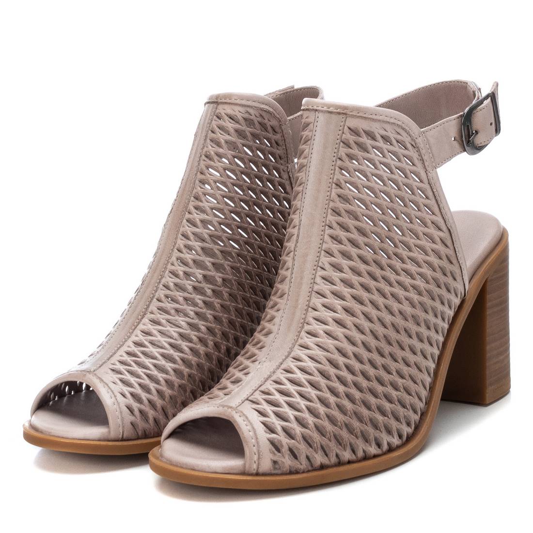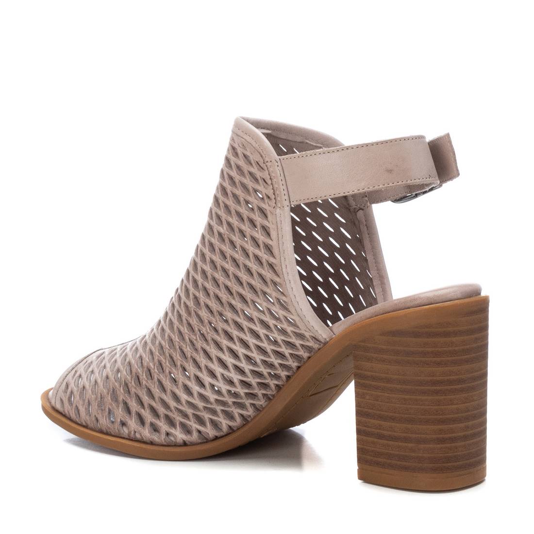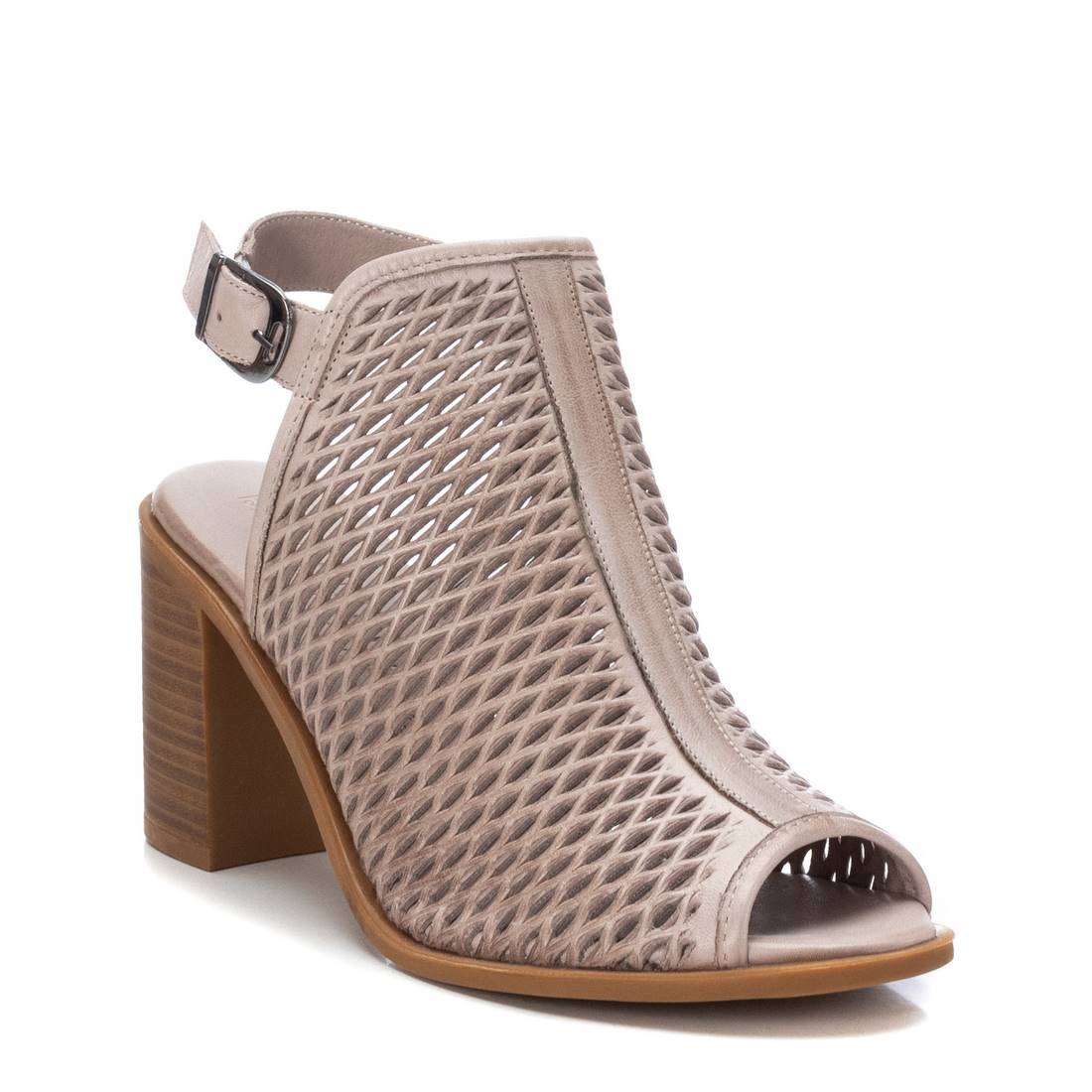 Sandalia abotinada de mujer, de la marca Carmela. Fabricada en piel de alta calidad con detalle calado con diseño geométrico. Tacón ancho de 9cm con suela antideslizante.