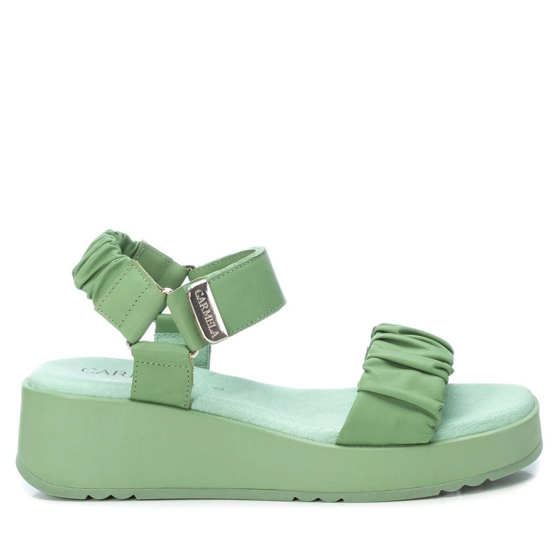 Sandalia de mujer de la marca Carmela. Fabricada en piel de alta calidad. Pala fruncida y pulsera al tobillo con trasera fruncida y cierre mediante tira adherente. Piso con pequeña cuña al tono del modelo y suela de goma antideslizante.