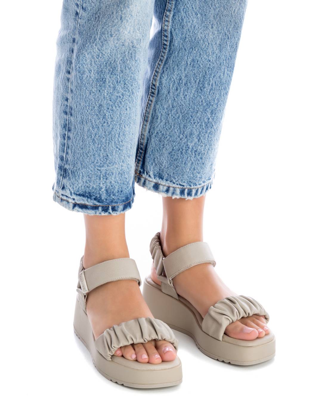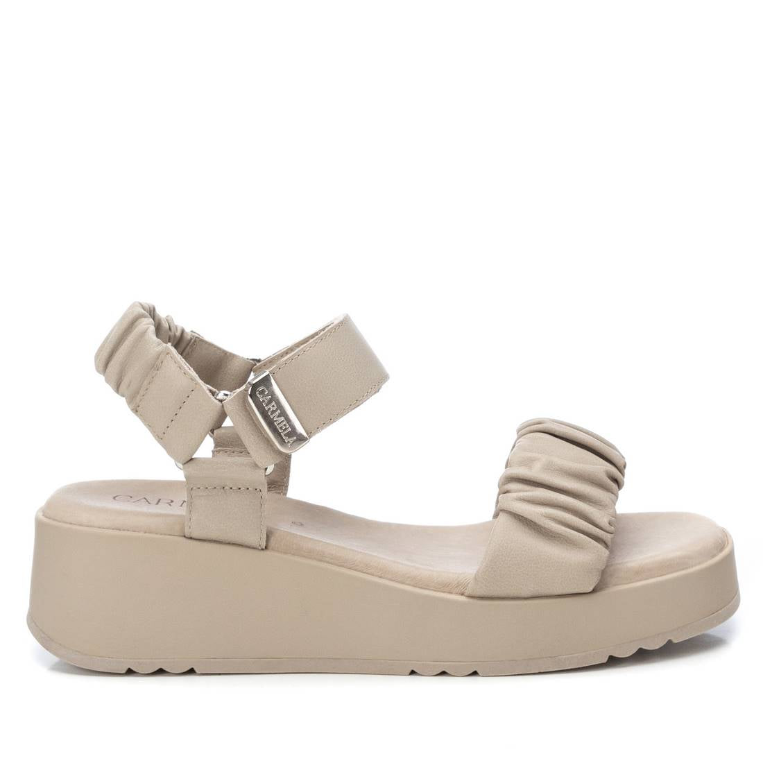 Sandalia de mujer de la marca Carmela. Fabricada en piel de alta calidad. Pala fruncida y pulsera al tobillo con trasera fruncida y cierre mediante tira adherente. Piso con pequeña cuña al tono del modelo y suela de goma antideslizante.