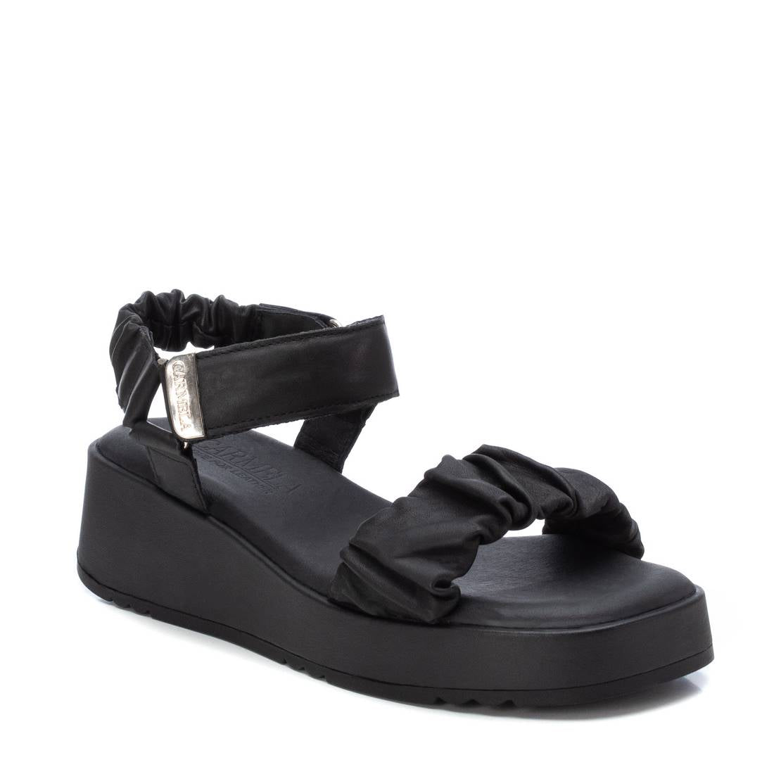 Sandalia de mujer de la marca Carmela. Fabricada en piel de alta calidad. Pala fruncida y pulsera al tobillo con trasera fruncida y cierre mediante tira adherente. Piso con pequeña cuña al tono del modelo y suela de goma antideslizante.