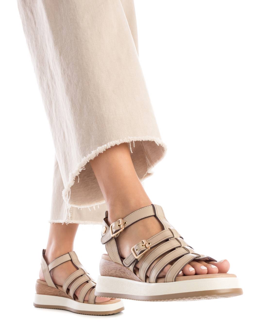 Sandalia de mujer, de la marca Carmela. Fabricada en piel de alta calidad. Modelo con tiras cruzadas y hebilla metálica decorativa en el frente. Cierre mediante correa con hebilla al tobillo. Cuña con plataforma delantera para mayor comodidad. Suela antideslizante.