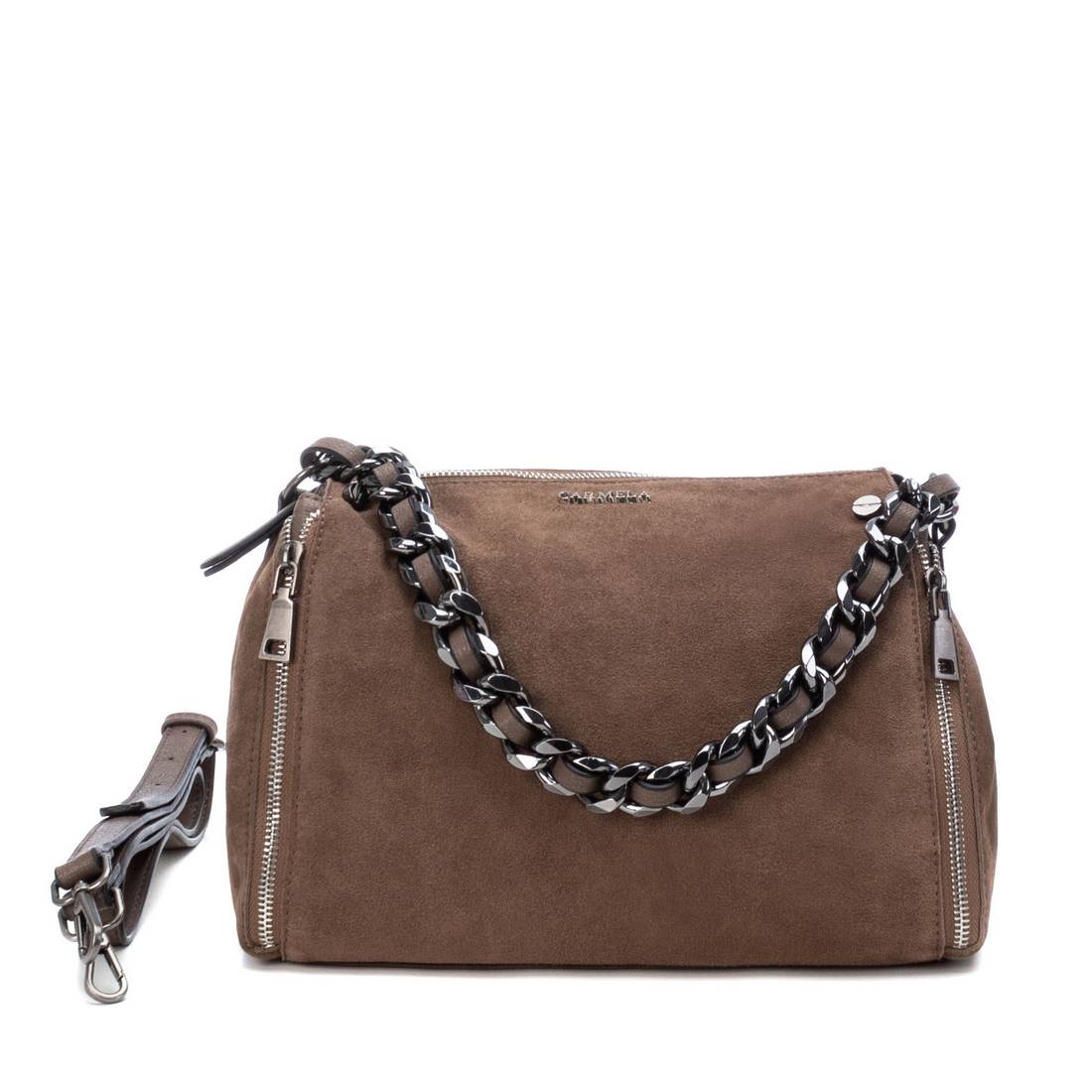 Bolsa média feminina, marca Carmela. Feito de couro dividido de alta qualidade. Fecho de correr. Alça com corrente de ombro e alça longa ajustável opcional. 6 bolsos perfeitos para manter tudo organizado. Medidas: 24 x 33 x 12 cm.