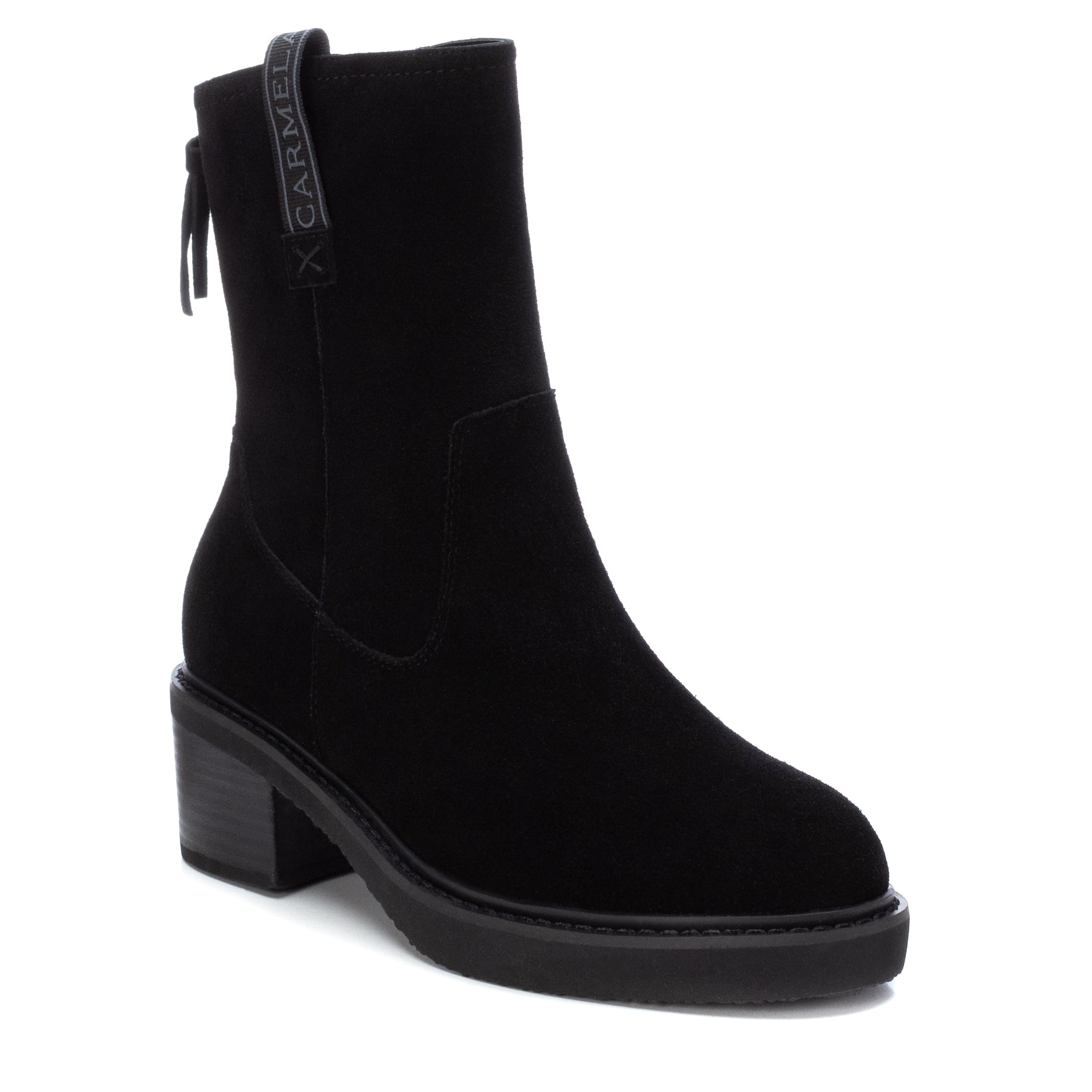Bota feminina de cano curto, da marca Carmela. Feito de camurça de qualidade. Zíper traseiro. Salto confortável de 5 cm e sola de borracha antiderrapante. Simplicidade e conforto para seus looks sazonais.