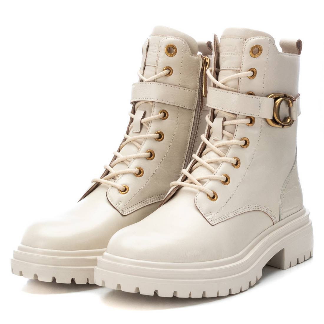 Bota militar feminina, da marca Carmela. Feito de couro de alta qualidade. Fecho de zíper lateral com cadarços ajustáveis. Alça com detalhe metálico com logo da marca. Sola de borracha antiderrapante