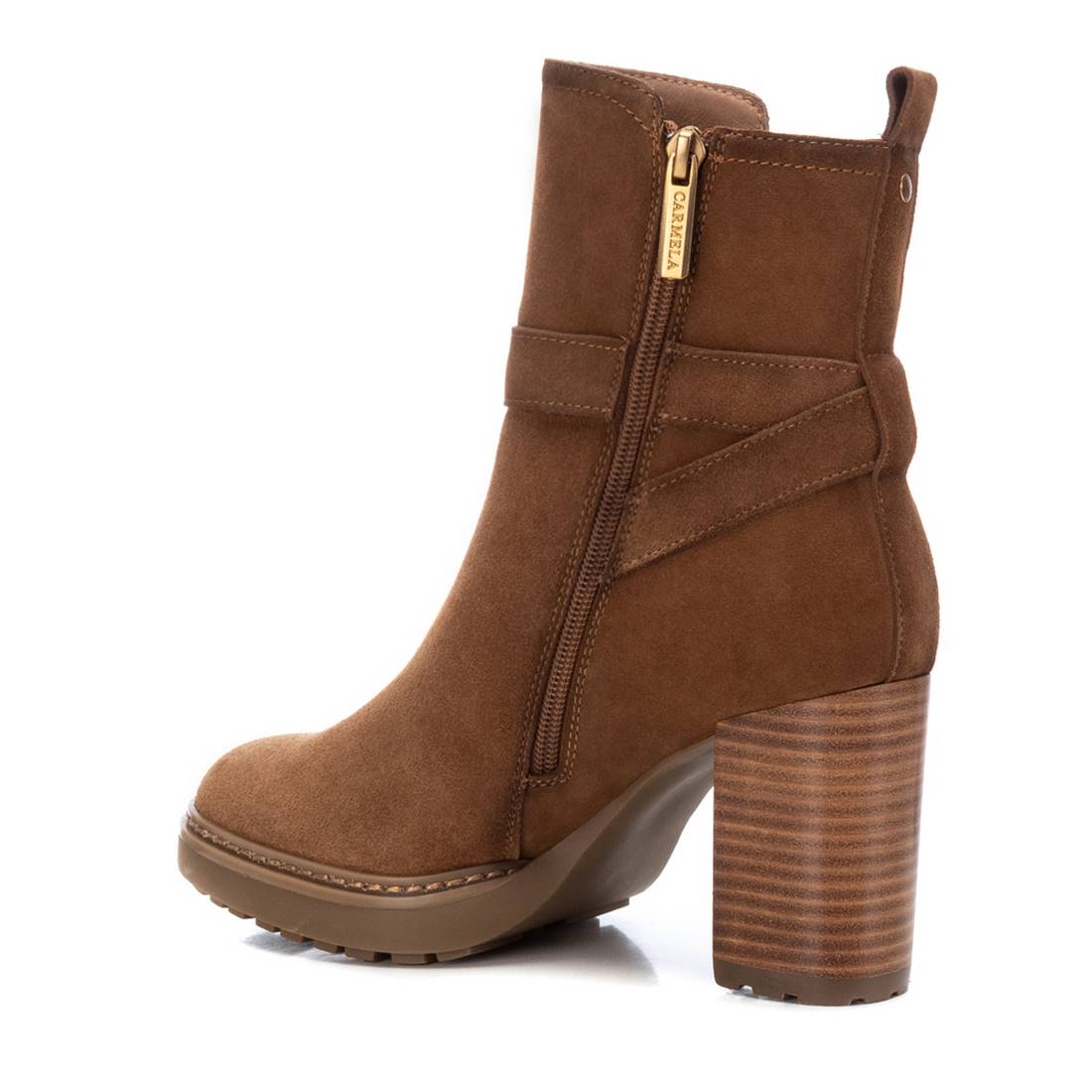 Bota feminina de cano curto, da marca Carmela. Feito de camurça de alta qualidade. Fecho de zíper lateral. Puxador traseiro para fácil colocação. Correia com fivela metálica decorativa. Salto de 8 cm de largura com plataforma frontal para maior conforto. Sola de borracha antiderrapante.