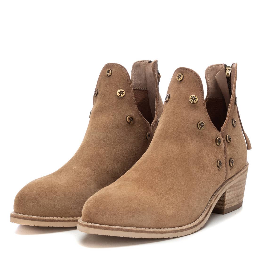 Bota feminina de cano curto, da marca Carmela. Feito de camurça de alta qualidade. Modelo decotado com fendas laterais e zíper decorativo nas costas. Design estilo cowboy com decoração de tachas. Salto de 5 cm e sola antiderrapante.