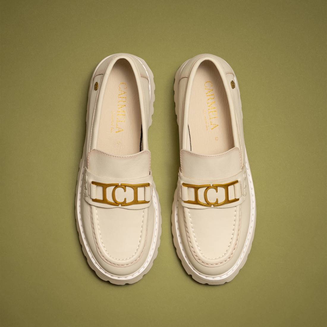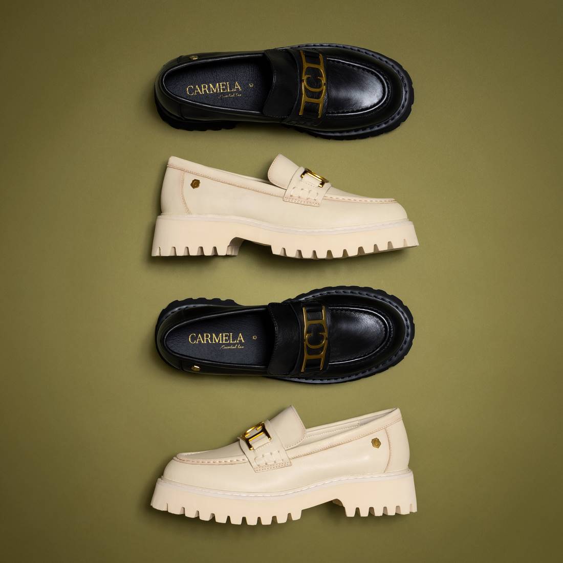 Mocassim feminino, marca Carmela. Fabricado em couro de alta qualidade. Máscara na frente com peça decorativa em metal com logótipo da marca. Sola leve e antiderrapante. Um modelo trendy que você usará com todos os looks casuais da estação.