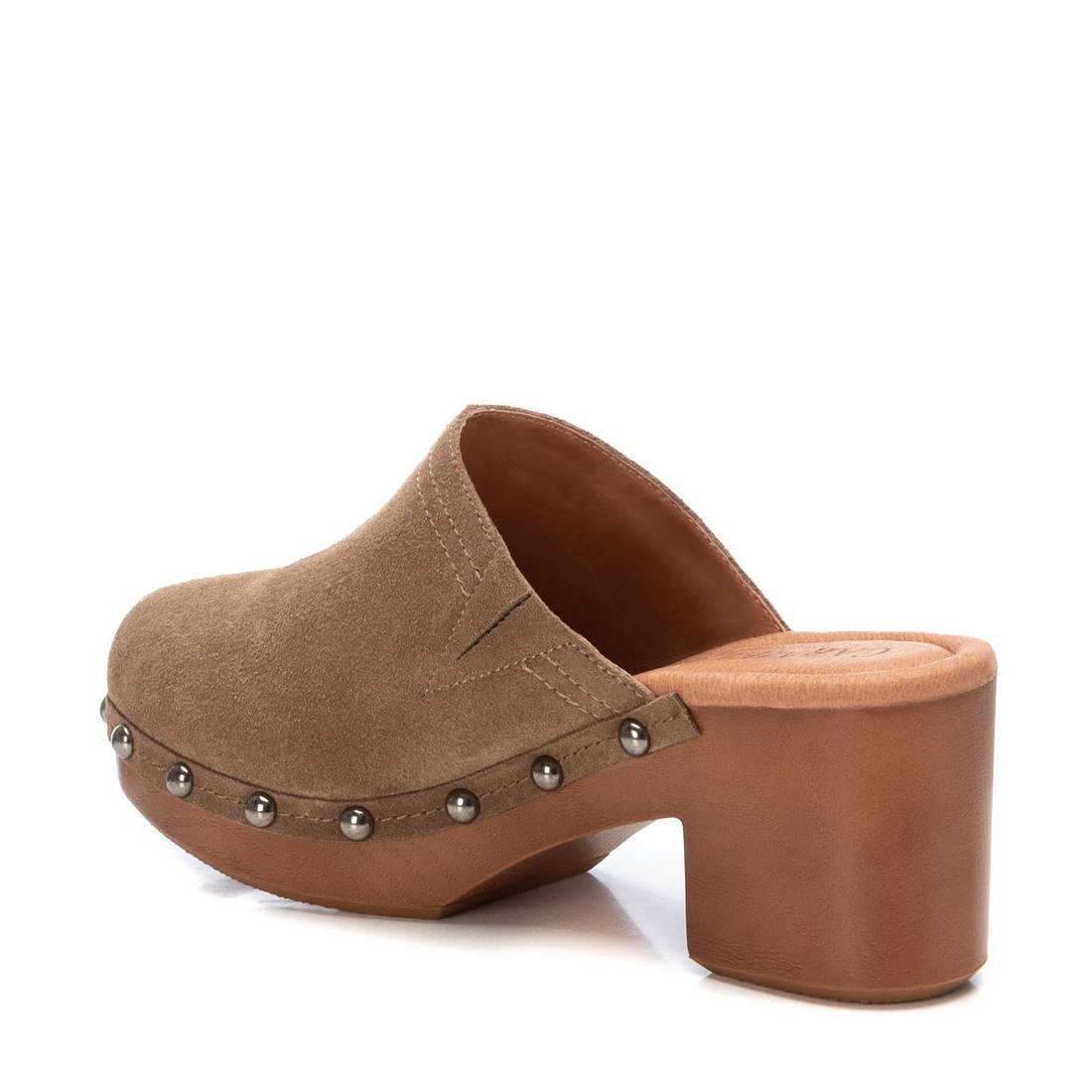 Tamanco feminino, marca Carmela. Feito de couro dividido de alta qualidade. Detalhe de tachas metálicas. Salto de 7 cm com plataforma frontal. Sola de borracha antiderrapante.